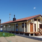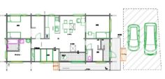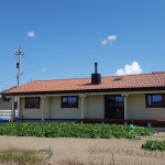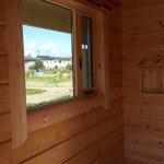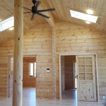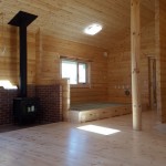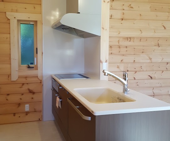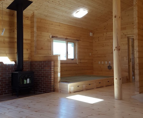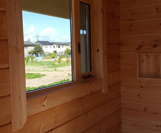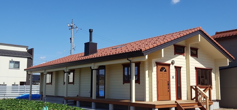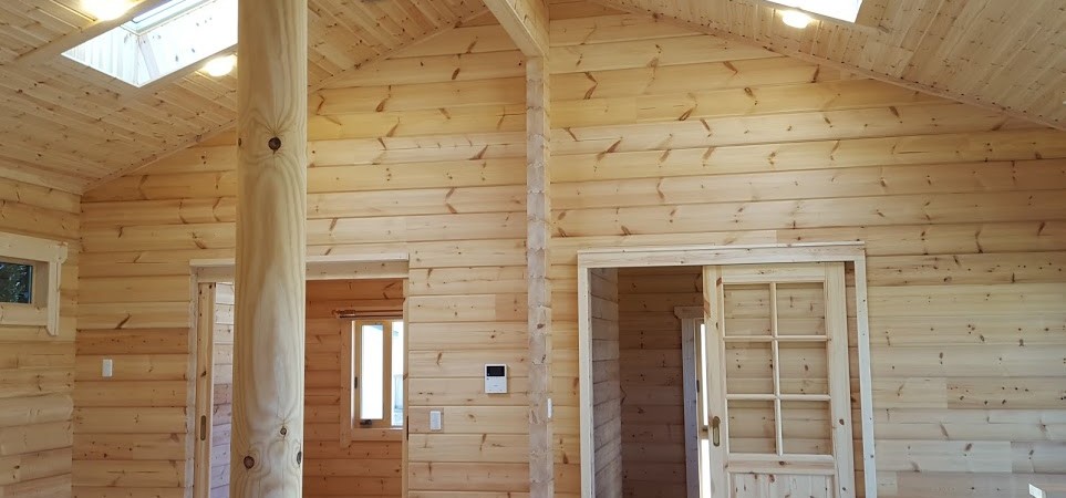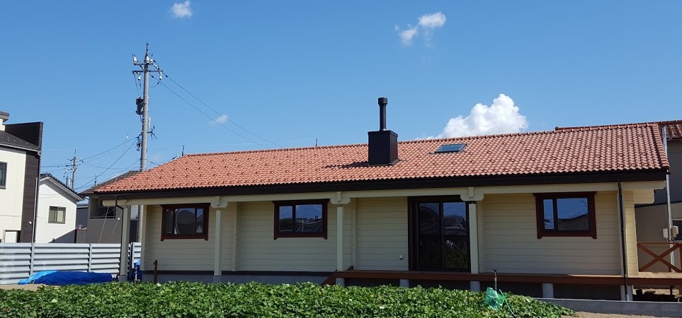 ログサイズは114㎜×180㎜のラミネートログハウスです。 平屋ですが屋根高が高いので室内が気持ちいいくらい広く感じますよ。 塗料はオリンピックのソリッドタイプ。お客様のセルフ塗装でホワイトをベースにした建物は洗練された感じがしますね。お洒落です。