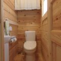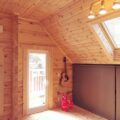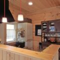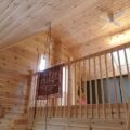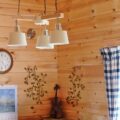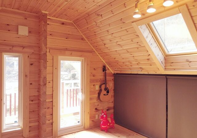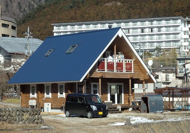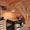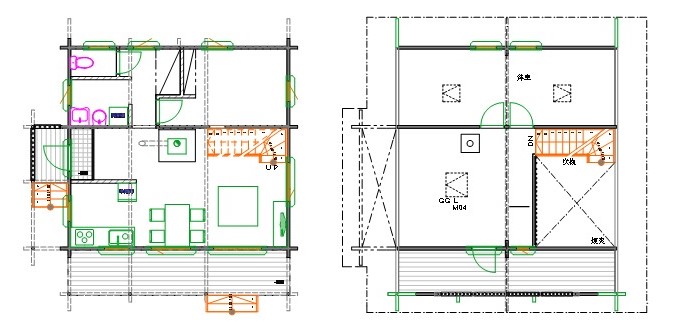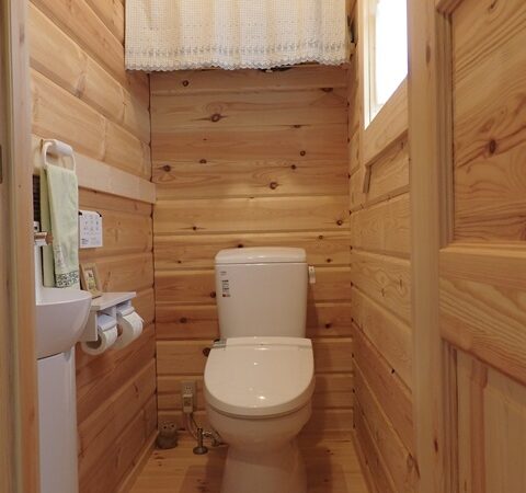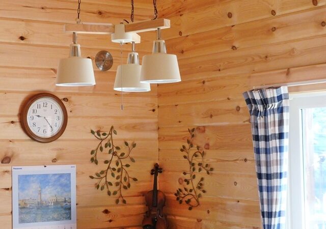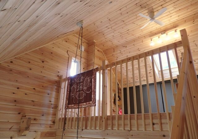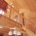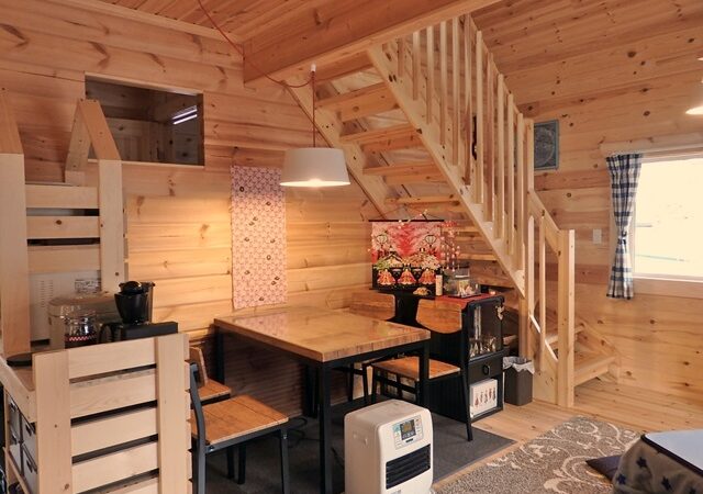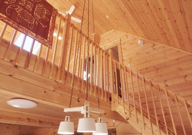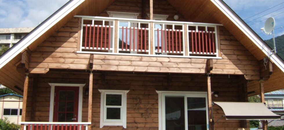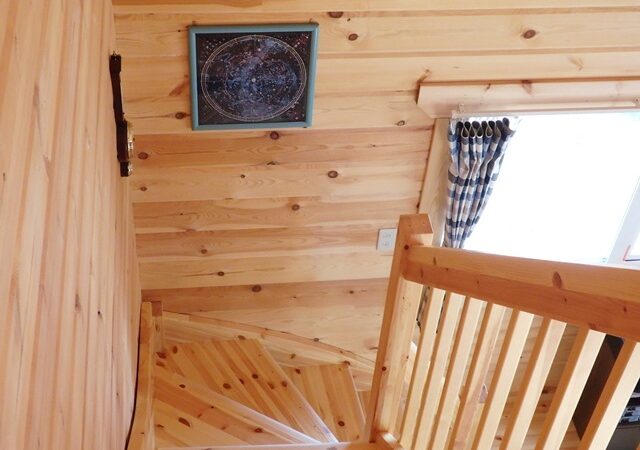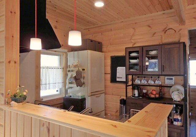 外観のカラーリングが素敵に塗装され、K様ご希望のフィンランドパイン無垢95㎜厚のログ材を使用しています。 無垢ですが反りや割れも少なくいい雰囲気です。