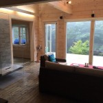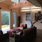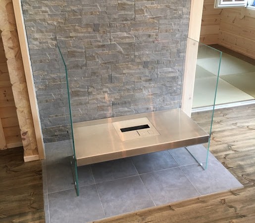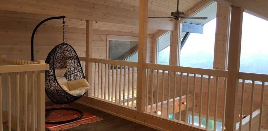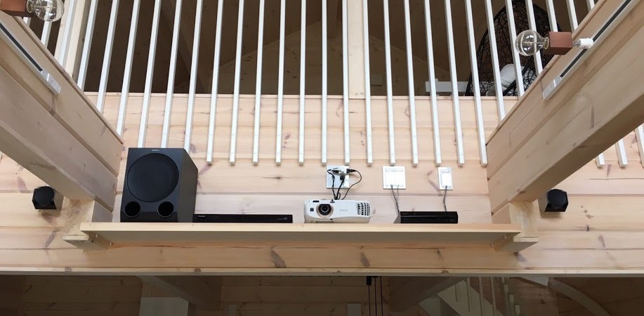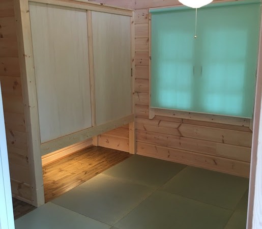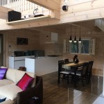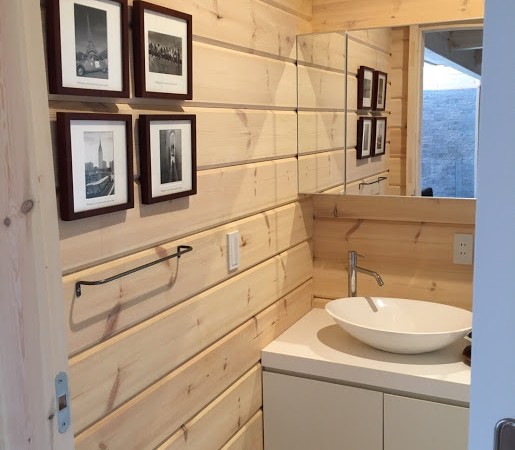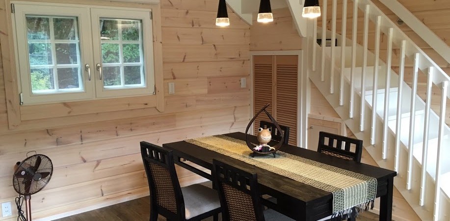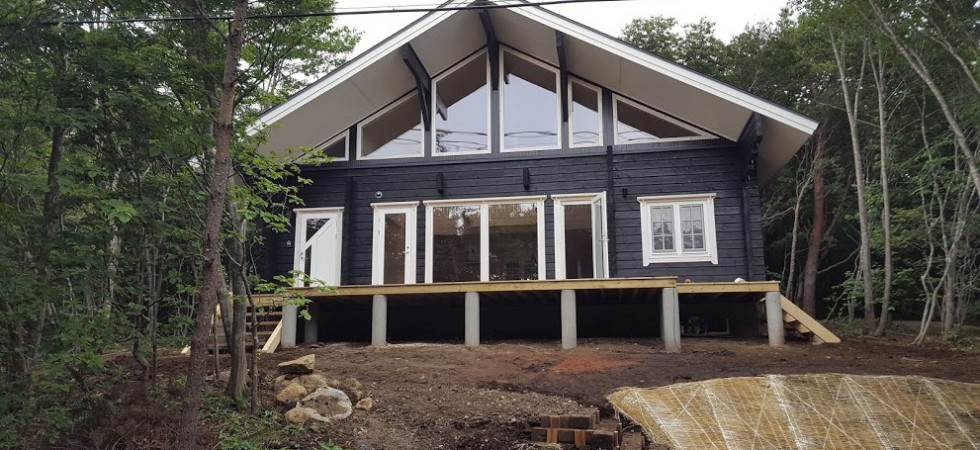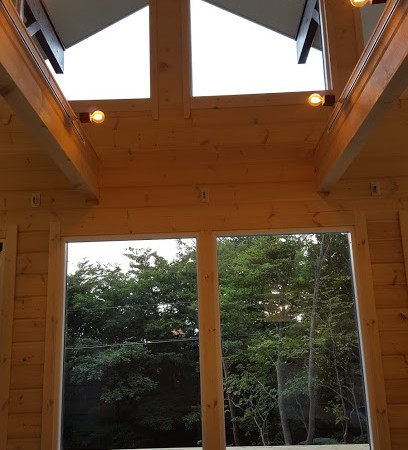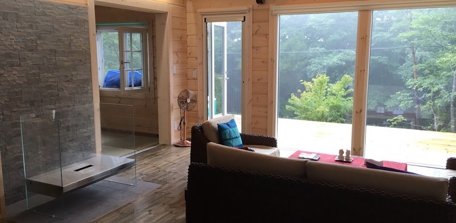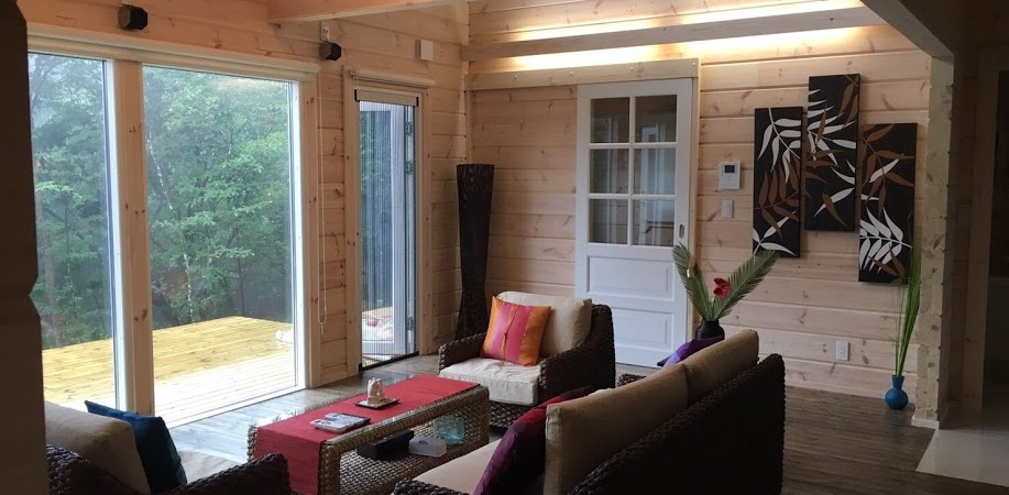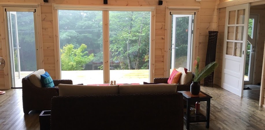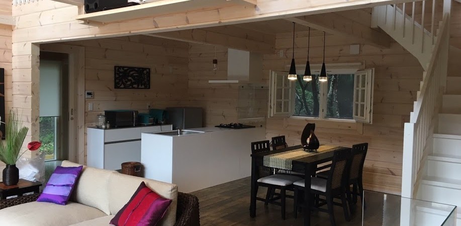 大きな開口による開放感と内外の繋がりのある一体感により、非日常を感じられるログハウスです。